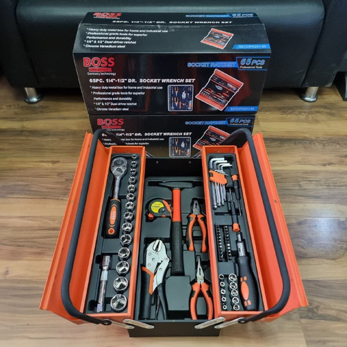 این مجموعه 65 پارچه بسیار نفیس و باکیفیت از برند خوشنام BOSS: از تولیدات درجه یک کشور چین است که به همراه یک جعبه ابزار فلزی مستحکم و مقاوم عرضه میشود. این محصول برخلاف جعبههای پلاستیکی یا کیفهای پارچهای عرضهشده برای بسیاری از مجموعههای ابزار، دارای عمری طولانی بوده و سالیان سال میتوانید ابزارهای خود را در این جعبه قرار دهید. این جعبه دارای 2 طبقه بوده و با مکانیزم پلکانی از وسط باز میشود. دستههای دوگانه این جعبه نیز از فلز ساخته شده است